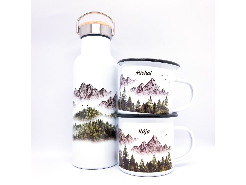 Nerezová termoláhev bamboo + dva hrníčky se jménem na přání.